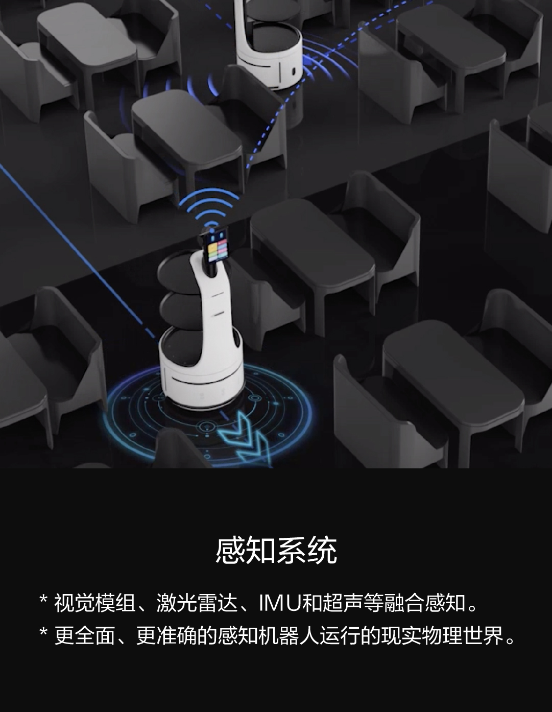 * 视觉模组、激光雷达、IMU和超声等融合感知。